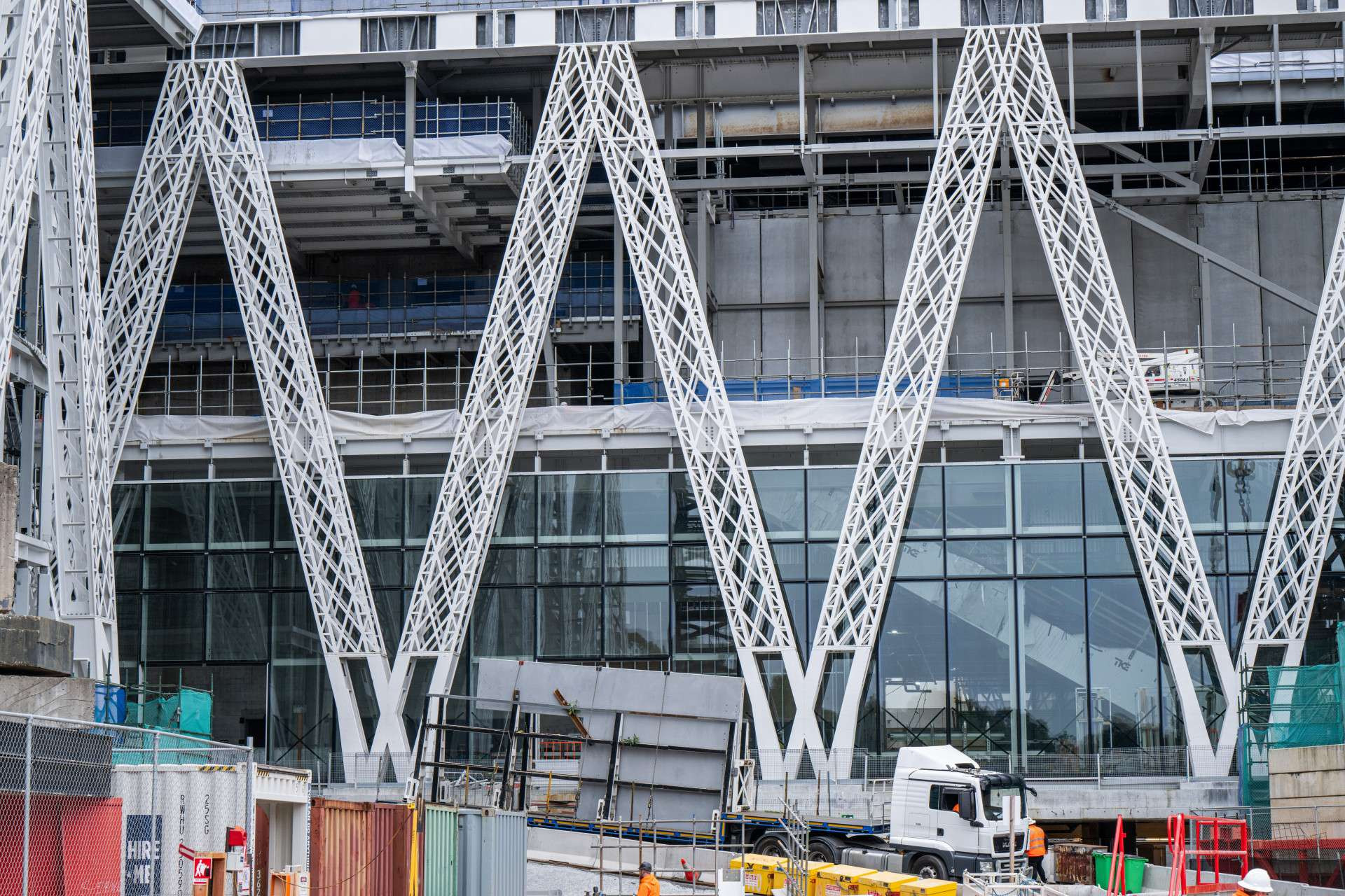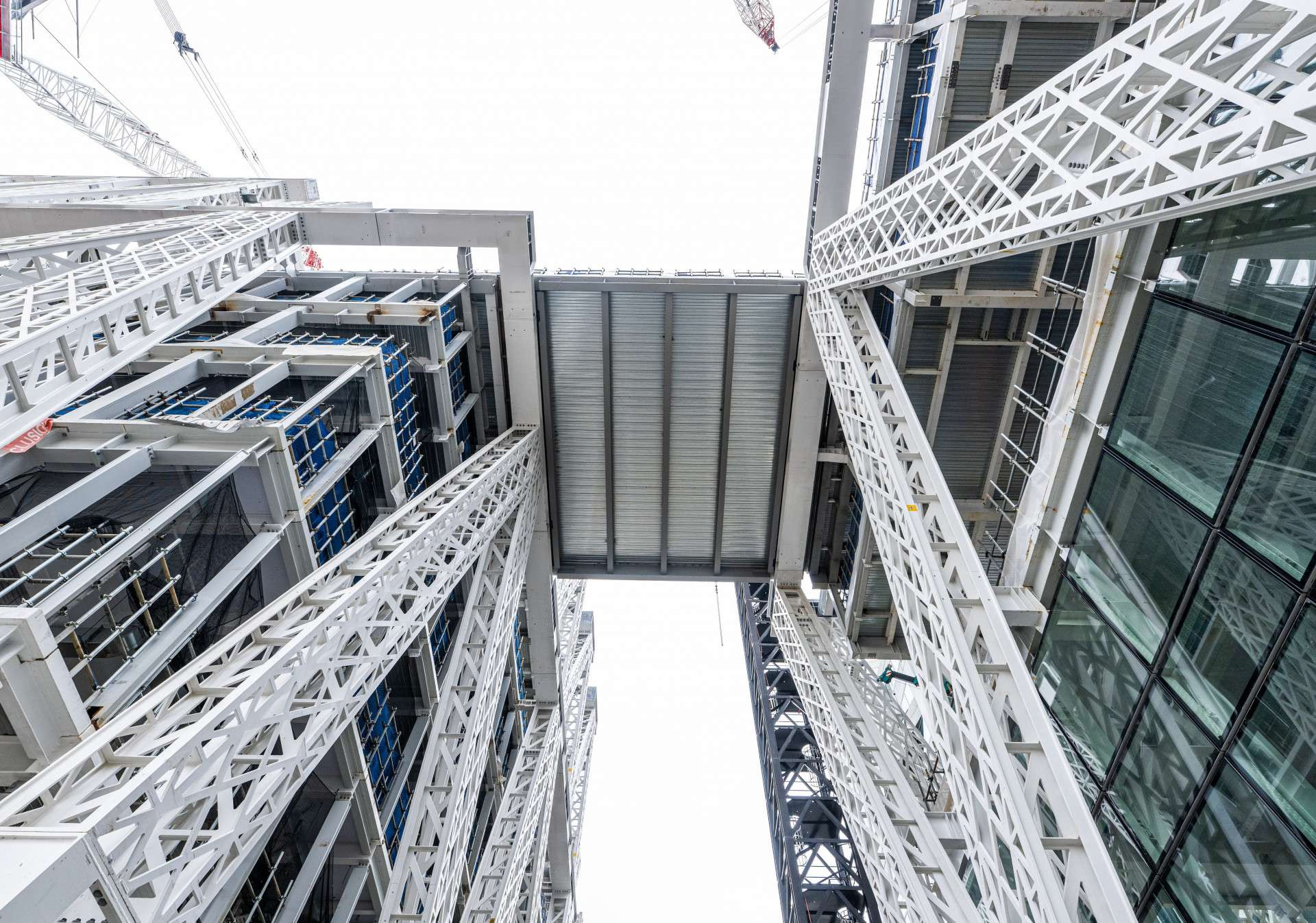 Weighing as much as 92 tonnes per truss and suspended more than 50 metres above ground on the western building, the double truss system is a key part of the building's framework.